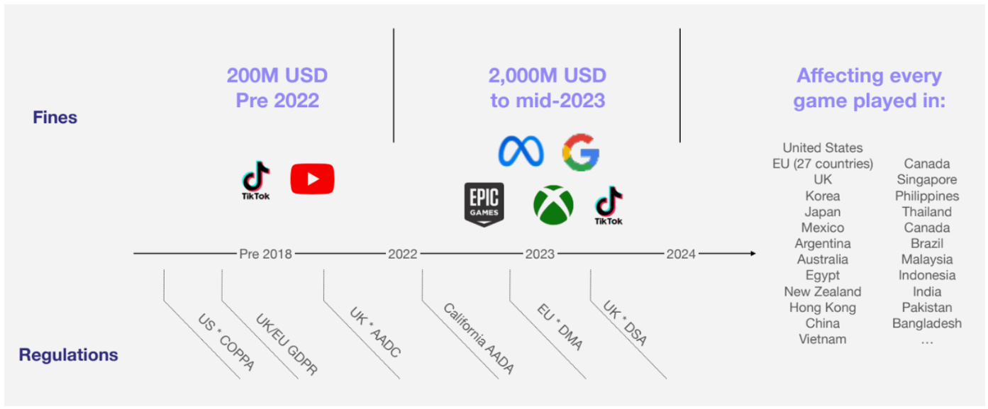 There are nearly a billion kids and teens globally that play games online. Hundreds of regulations affect their online experience, with more complex rules on the way. Regulators are vigorously enforcing these rules, with record fines and business-critical consequences. In the past two years alone, publishers, including Microsoft Xbox, Meta, and Google, have paid well over $2 billion in fines for violating kids’ privacy and safety.