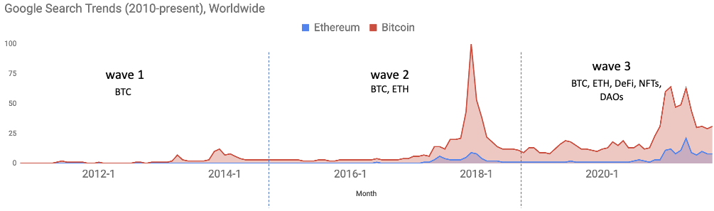 Crypto and blockchain tech are entering the mainstream zeitgeist in a meaningful way. The latest crypto rally began in Sept 2020, driven by institutional financial services and F500 investors, as well as retail investors across markets such as US, India, Indonesia, S. Korea and China, when Bitcoin prices grew from ~$10k to a peak of $63k in Oct 2021. Global cryptocurrency monthly trading volumes have also significantly increased in 2021, growing from $271B in Q1 2020, to $793B in Q4 2020, to a peak of $2.2T in May 2021 [1].