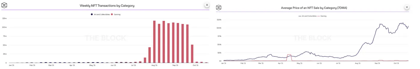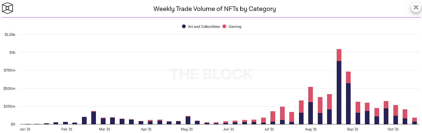 The simplest way to think of NFTs is as a blockchain native file format that inherits the properties typical of a blockchain asset: ownership status, prior ownership/transaction lineage, as well as lineage of value associated with the asset — all of it shared openly and transparently. While you could think of NFTs as a way to tokenize a variety of digital and physical assets and put them on a blockchain, at its core NFTs are yet another way for people to show off in the digital world. They’ve been around since 2015, but have recently seen a lot of buzz. OpenSea, the largest NFT marketplace in the world, is going to pass $10B in cumulative trading volume[7] in October 2021. It had crossed $1B in cumulative trades only in July 2021, so the growth has been phenomenal. Typically we see NFTs being used in digital art (artist created and generative), pop-culture (old memes getting sold as NFTs), sports moments (NBA top-shots), games, and even life experiences (creators recording a unique 1-off video for a fan). As visible in the chart, while NFT trading volumes were initially dominated by art/collectibles, lately gaming-related NFTs have started to see strong adoption within the NFT community.