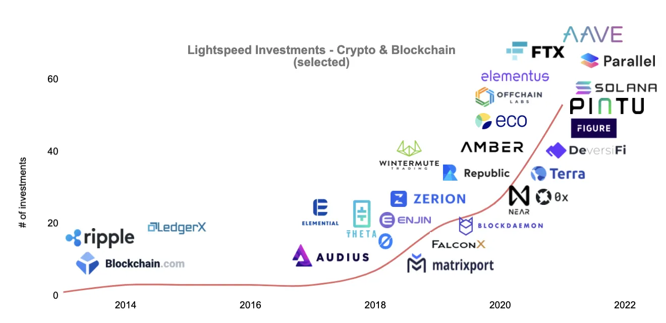 At Lightspeed we’ve been active in the category since 2013. We started our crypto investment journey with an investment in Blockchain.com — a global leader in crypto services and the market-leading BTC wallet representing over 35% of all BTC on-chain transactions. Since then, we have directly or indirectly (via LP positions) invested in over 50 leading companies across all categories of crypto and blockchain including brokerages, market-makers and exchanges across the world, such as Pintu, Amber, Wintermute and FTX; DeFi products such as Aave, 0x, Zerion, Parallel; and L1 & L2s such as NEAR, Theta, Terra, OffChain Labs/Arbitrum, and more.
